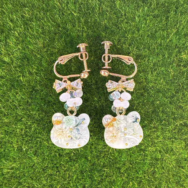 森のおうちでひとつずつそっと包んだ、小さなお花の贈りもの。 透明感のあるレジンの中に、本物のお花を閉じ込めて、ふんわりとやさしいピンクの小花を添えました。 ゴールドのリボンパーツときらきらビーズが、おめかしした日の特別感をそっと引き立てます。 大切な人との時間や、自分へのごほうびに。 森の仲間たちも「これ、きっと似合うと思うな」ってこっそり耳打ちしてくれる、そんなイヤリングです。 ピアスに変更もできますので、ご希望があればお知らせくださいね。 ⸻ 「森のくまさんmoff」からのひとこと 「お花たちが、きみの耳もとでそっと咲くように…心を込めて選んでみたよ」
