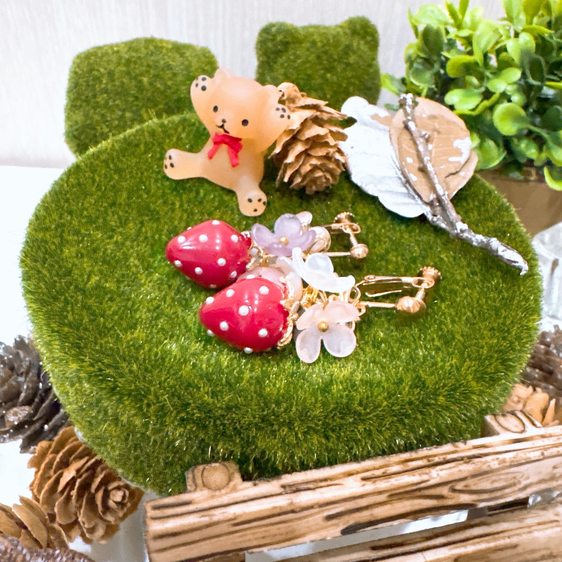【手作りアクセサリー】苺と花のゆらめきイヤリング♡01