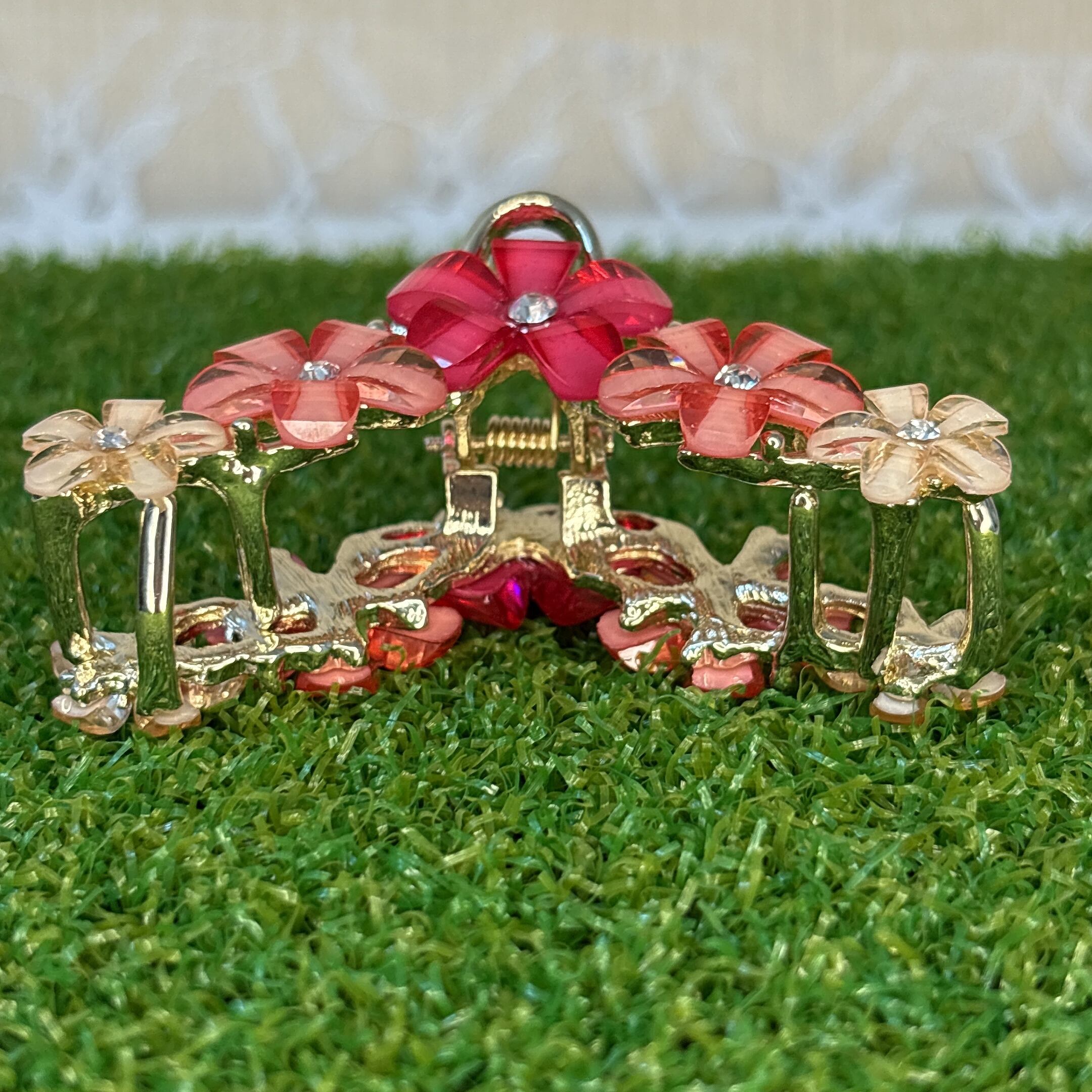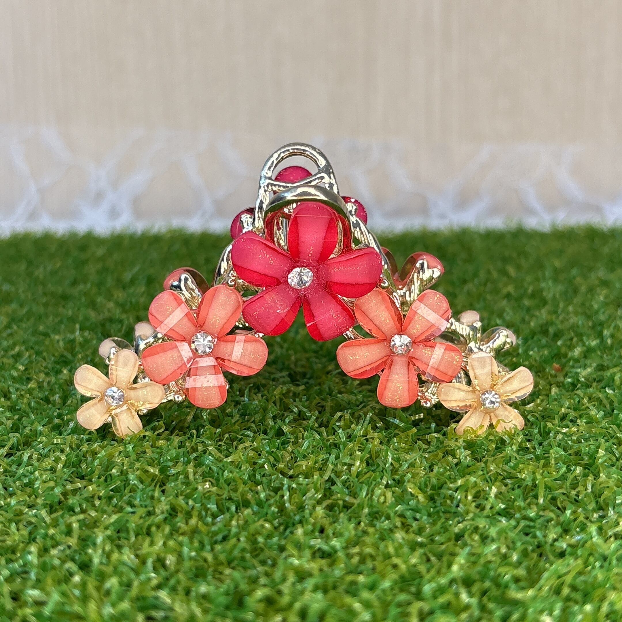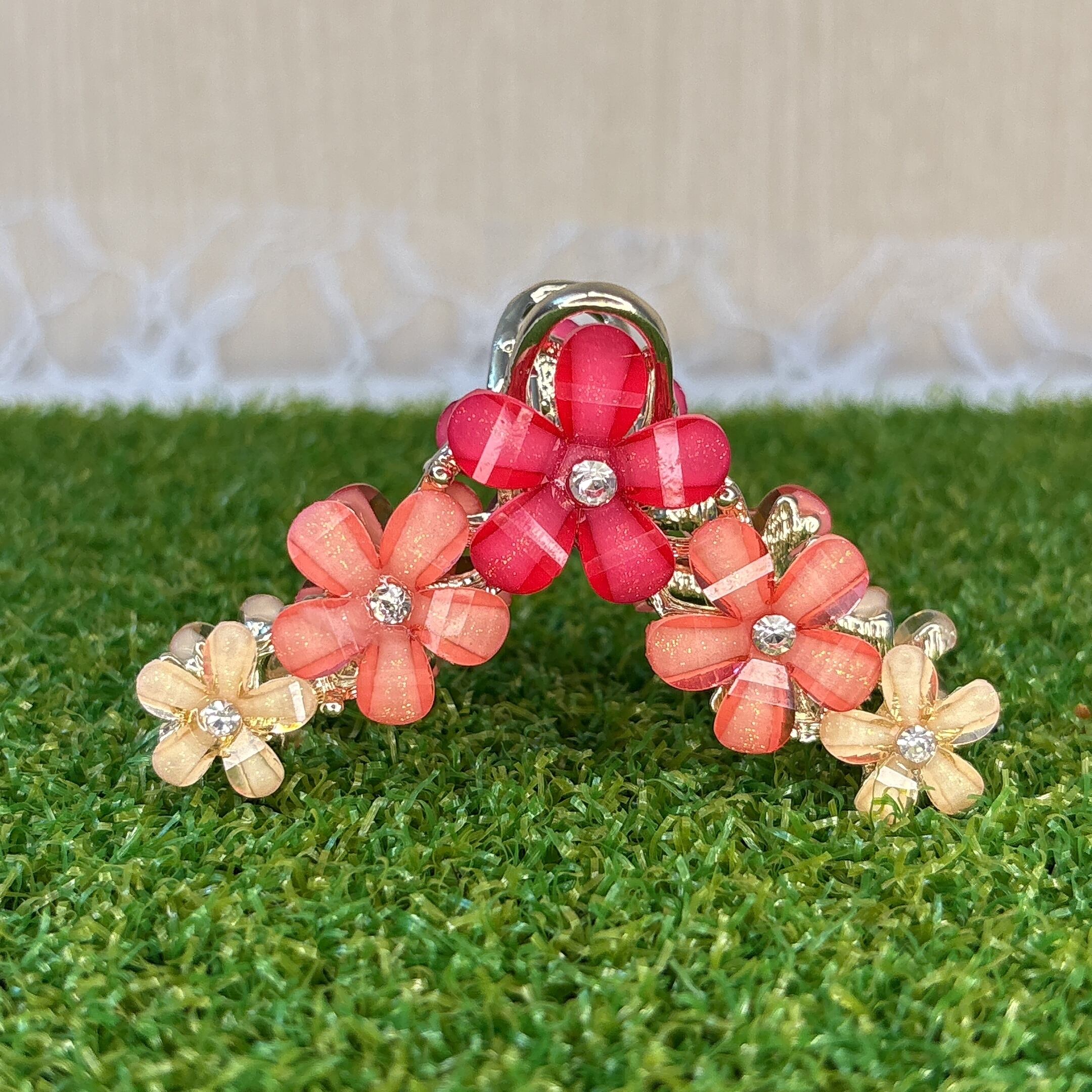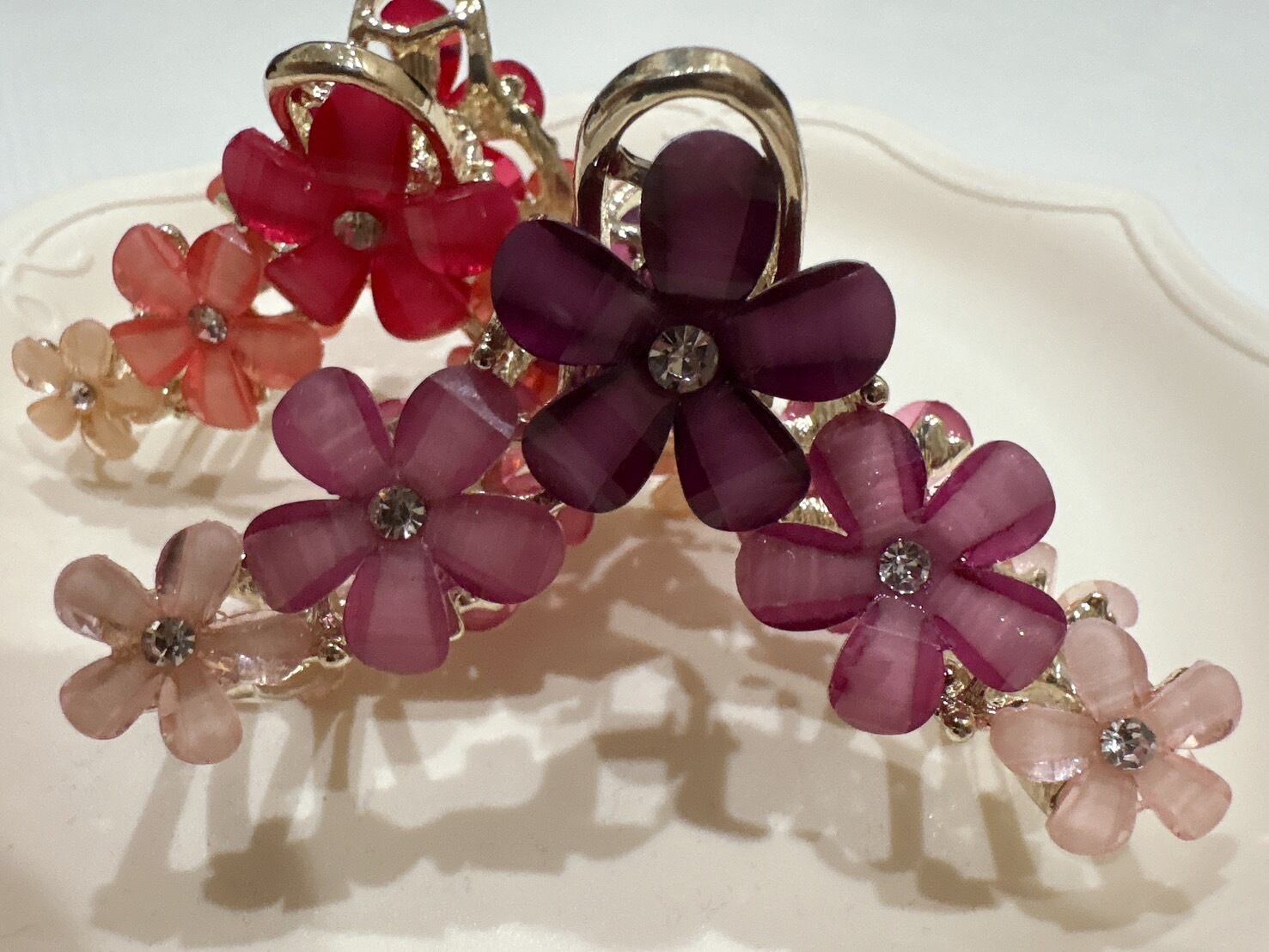 透け感のある花びらとビジューの輝きが目を引くメタルバンスクリップ。