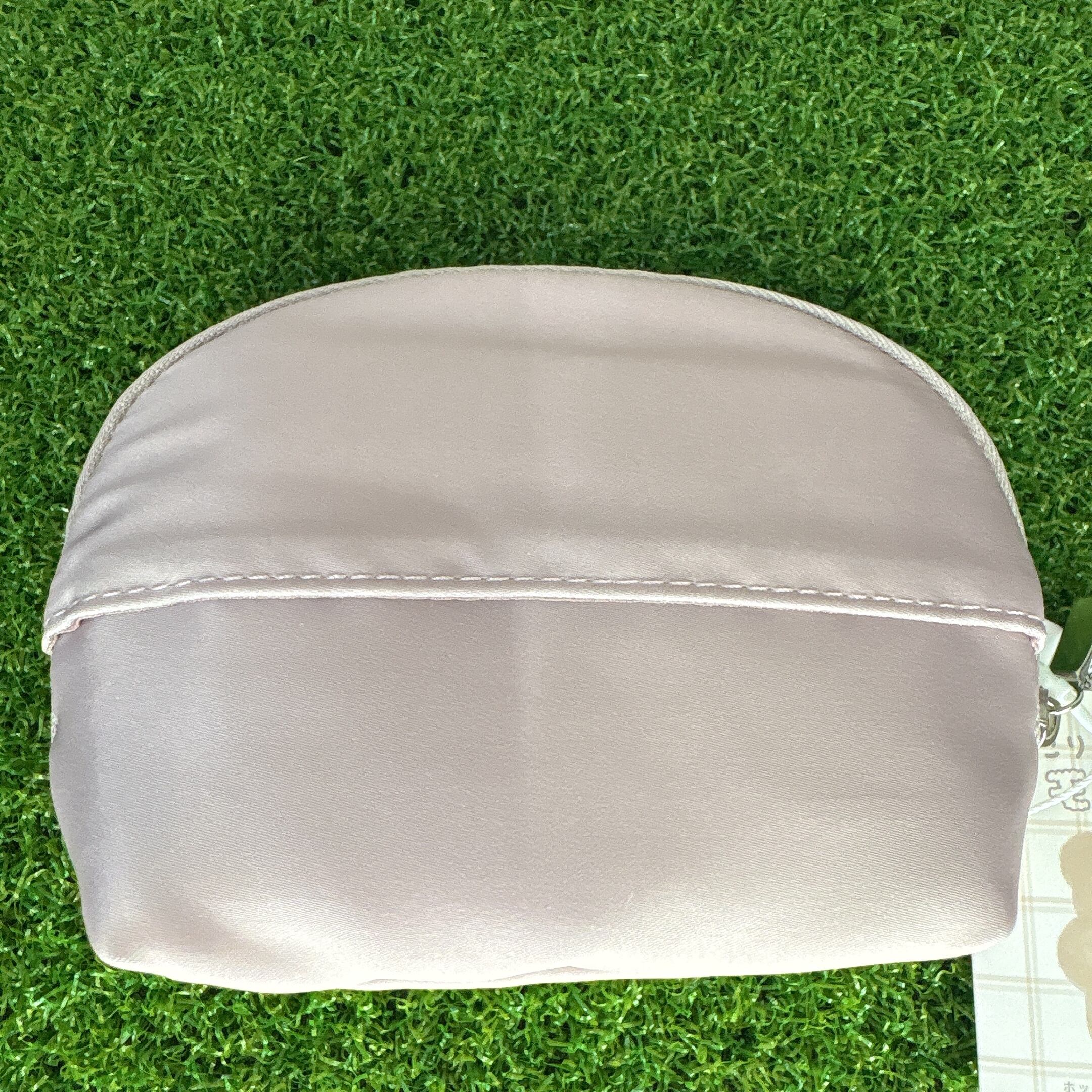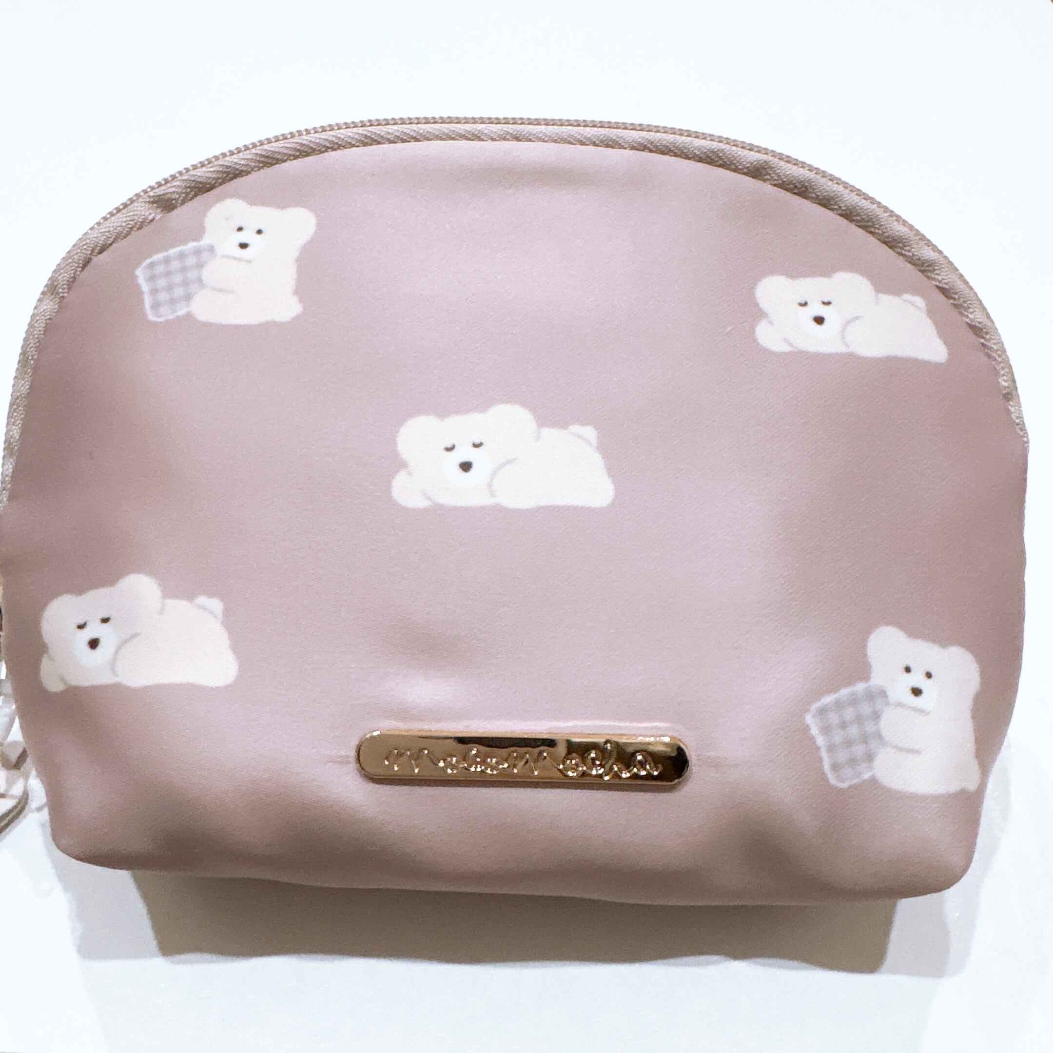ほっこりモコモカのくまさんたちが描かれた、やさしいピンクベージュのポーチだよ。