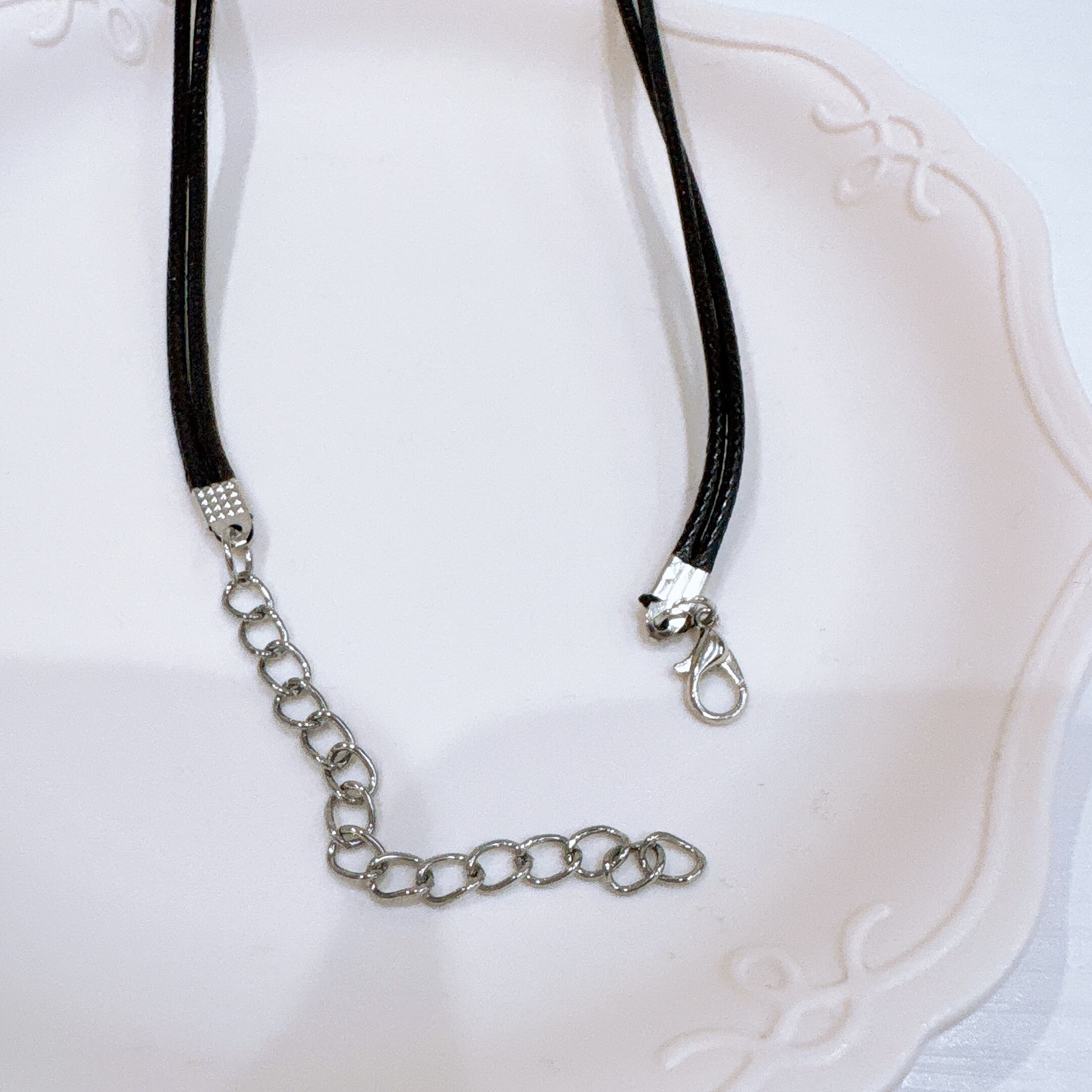 黒のレザー調コードは落ち着いた雰囲気で、甘さを抑えつつも女性らしさを引き立てます。