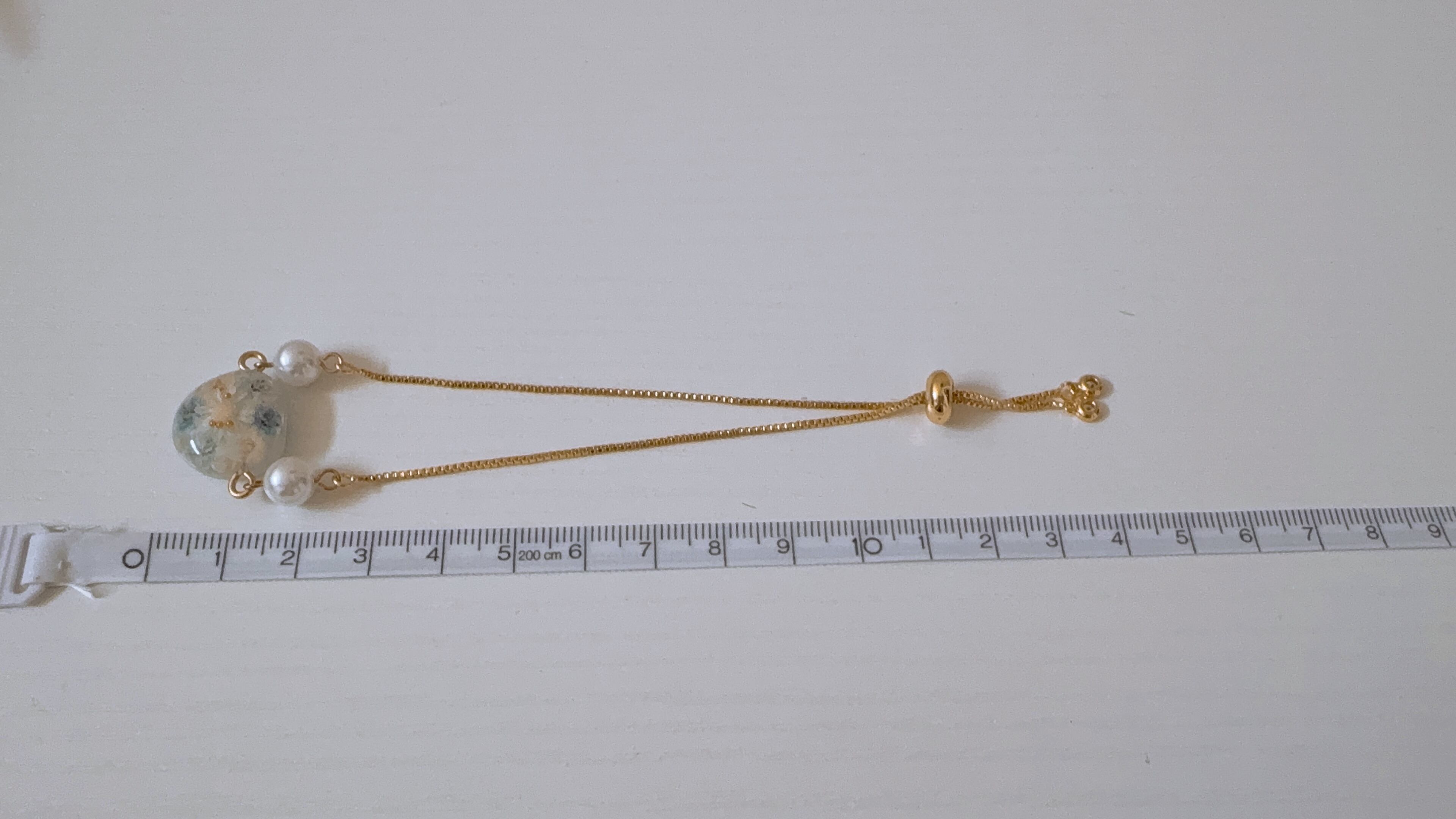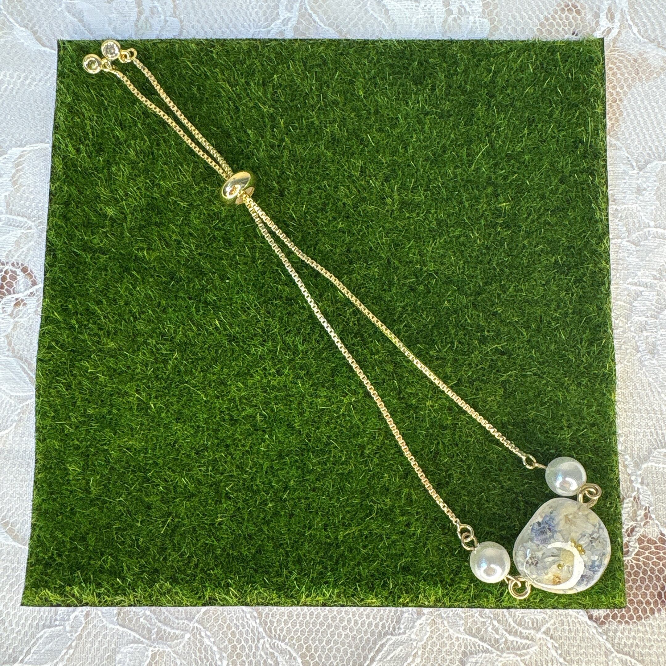 本物のお花をぎゅっと閉じ込めた、透明感のある丸いチャームがポイントのブレスレットです。
