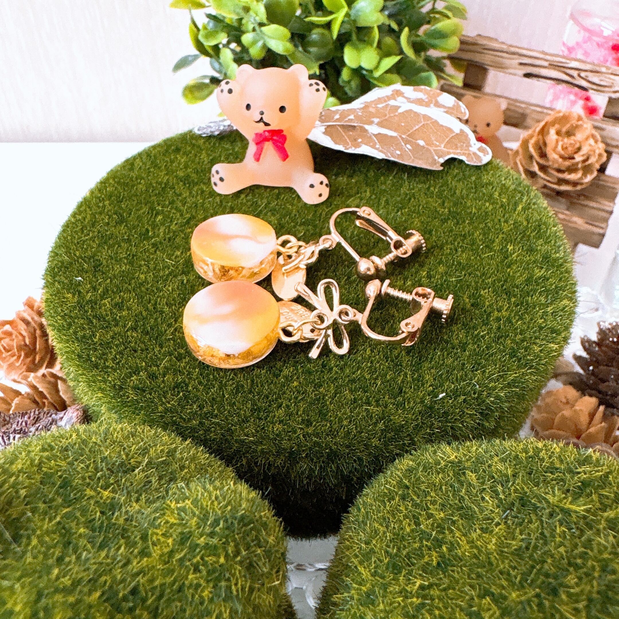あたたかな琥珀色の中に、小さな白いお花を閉じ込めたデザインは、まるで森で見つけた小さな宝物。リボンモチーフの金具は、きつねさんが「そっと結んでおいたよ」って心を込めてくれたんだ。