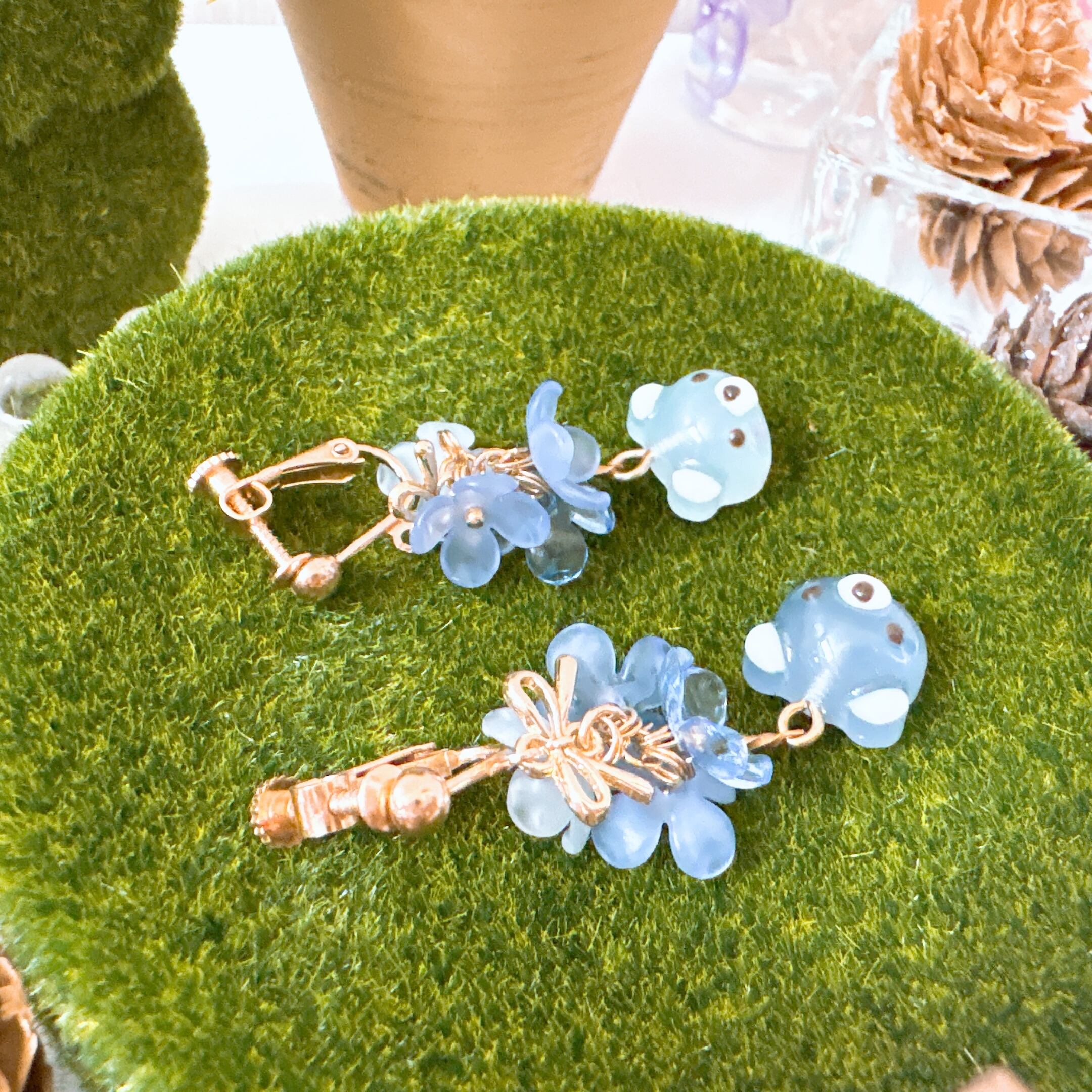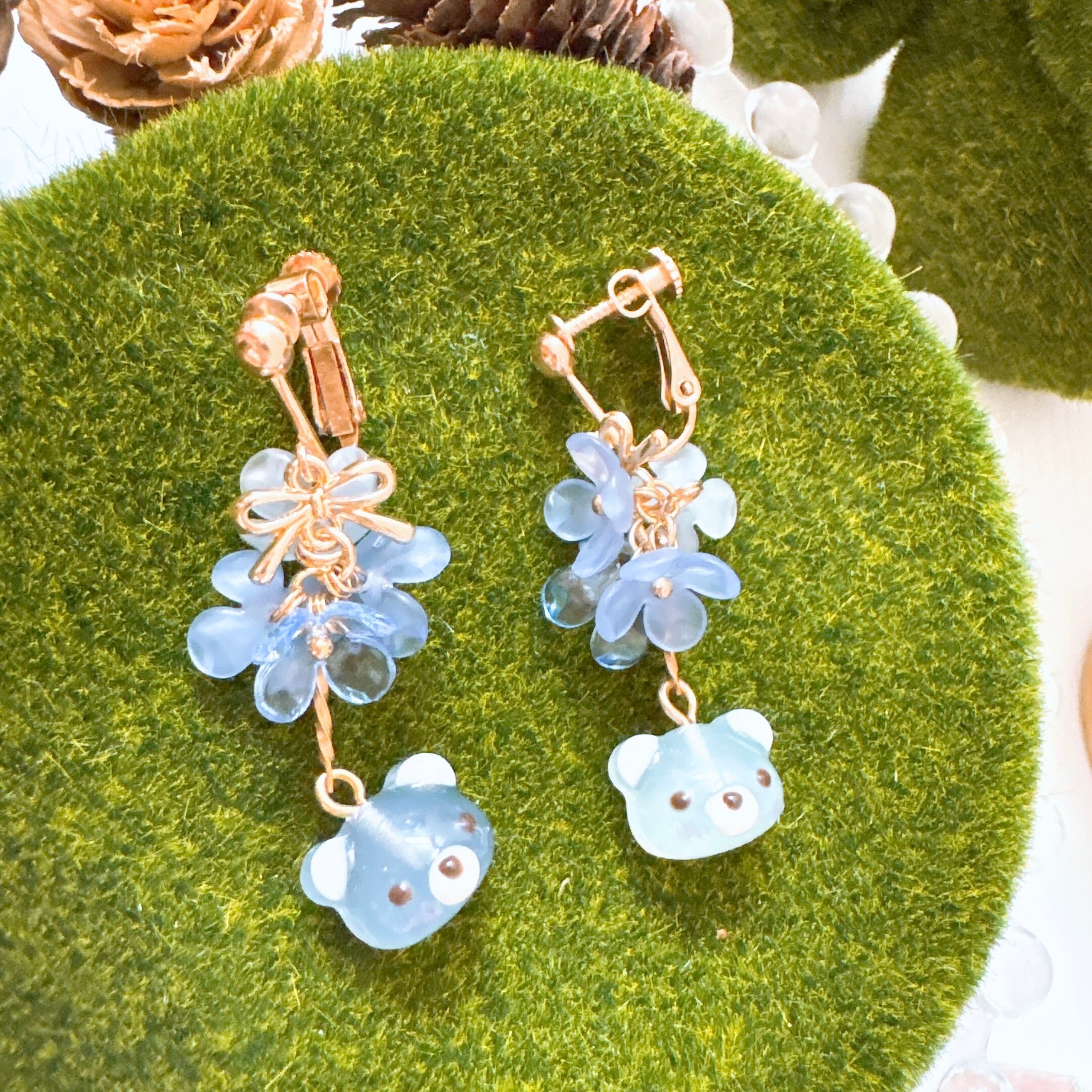 森のおうちから飛び出してきたみたいな、小さな青いこぐまたちのイヤリングだよ。