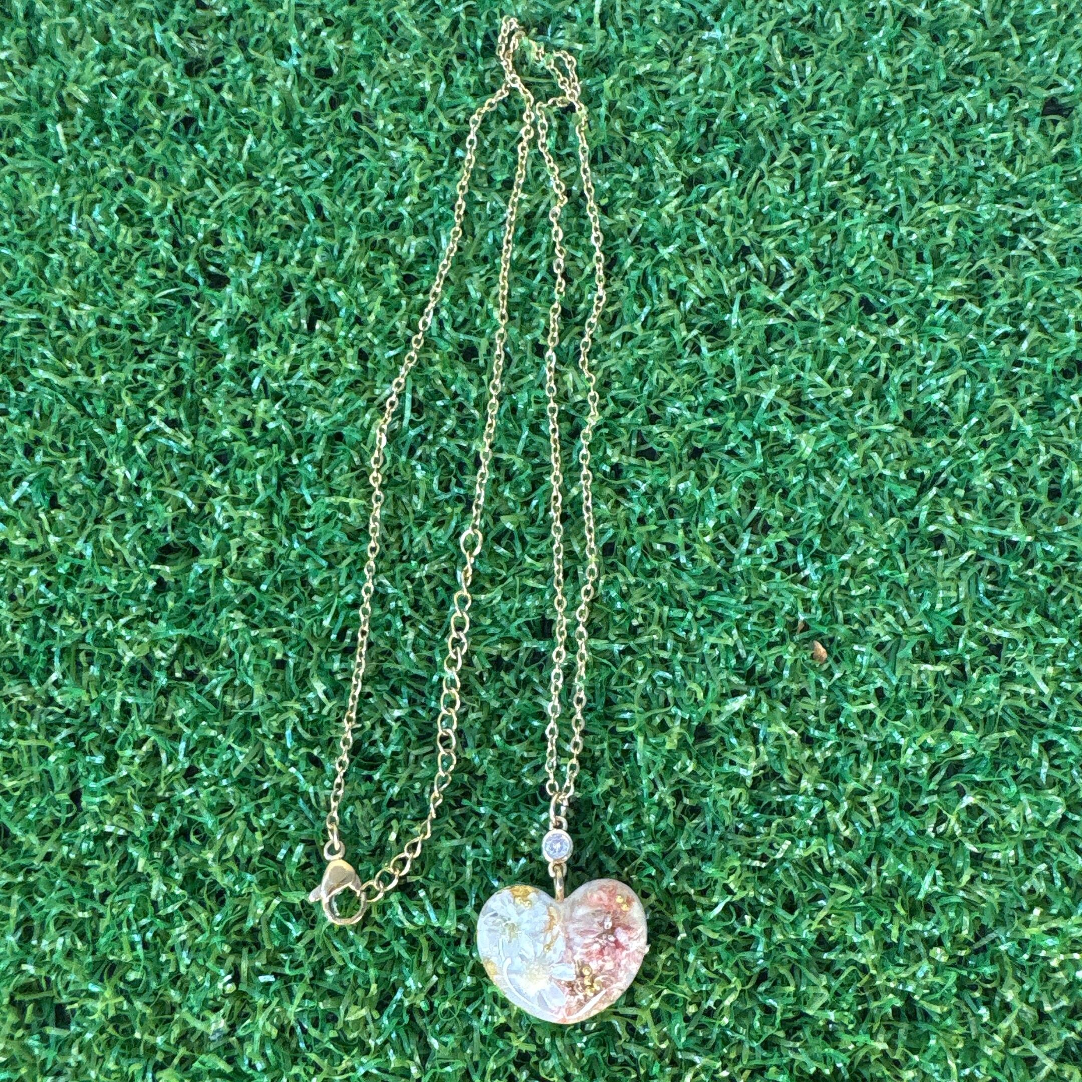 その花たちを、moffがそっとハートに包んで、お守りみたいに仕上げたネックレスです。