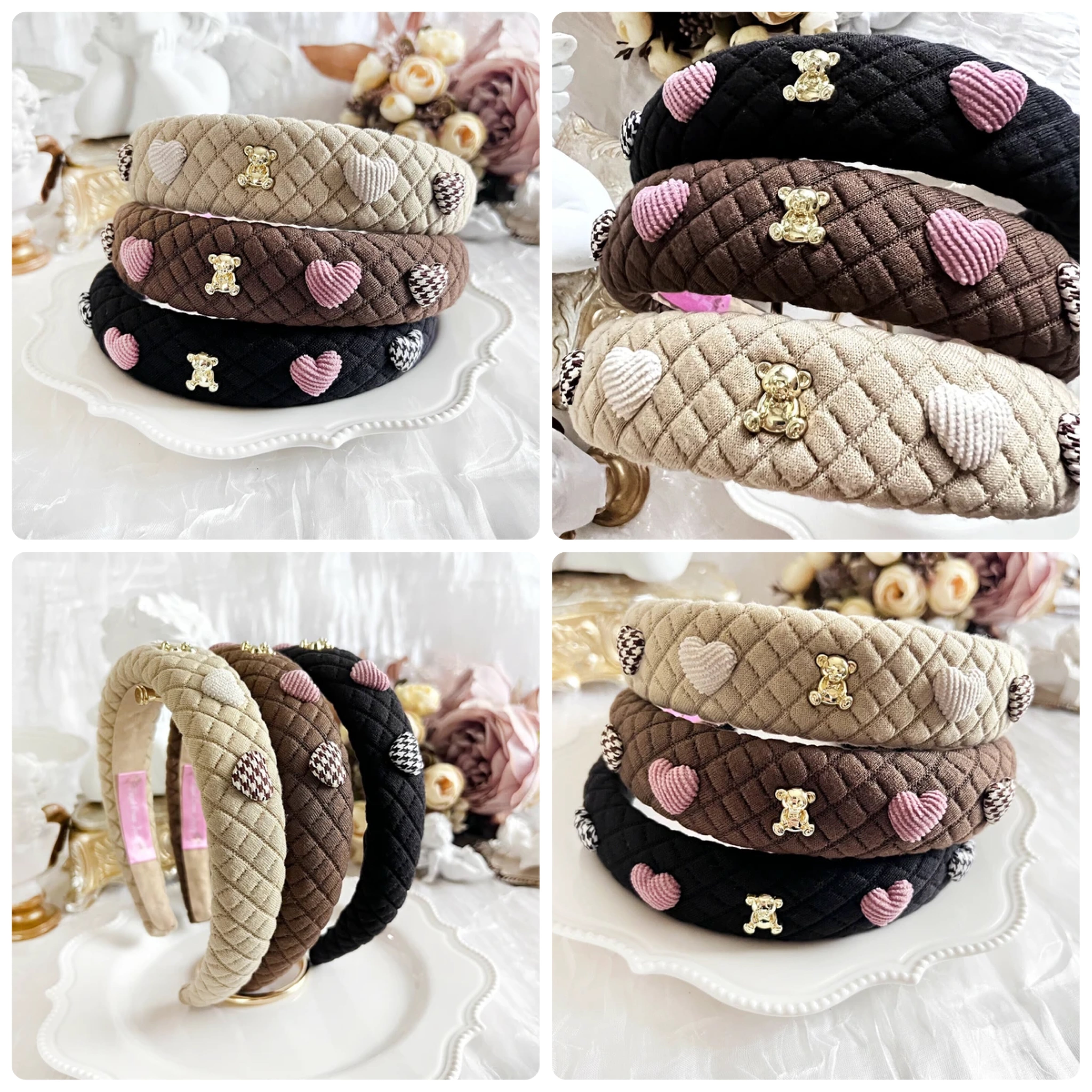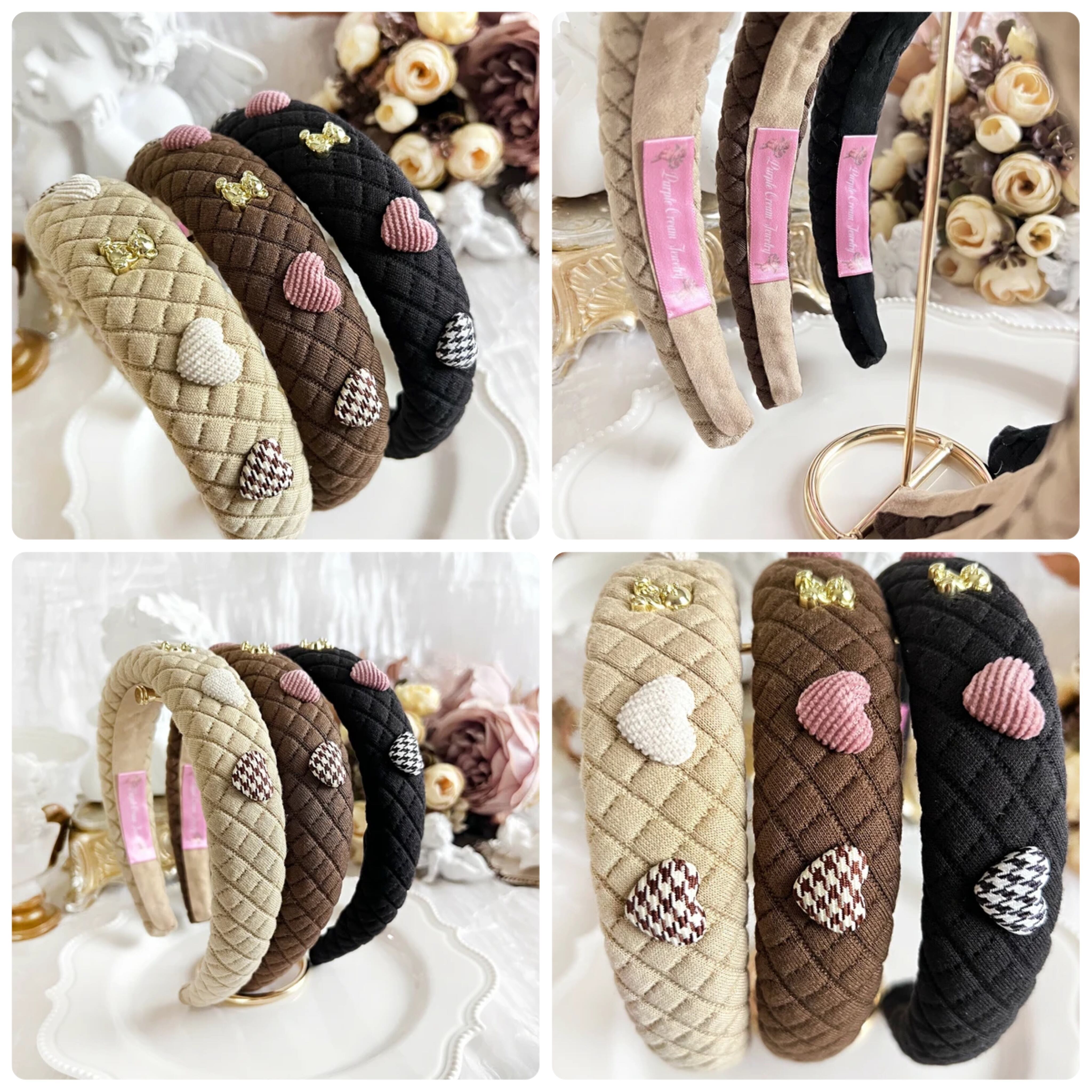クマとコーデュロイハート、千鳥格子ハートがついたキルティングカチューシャ